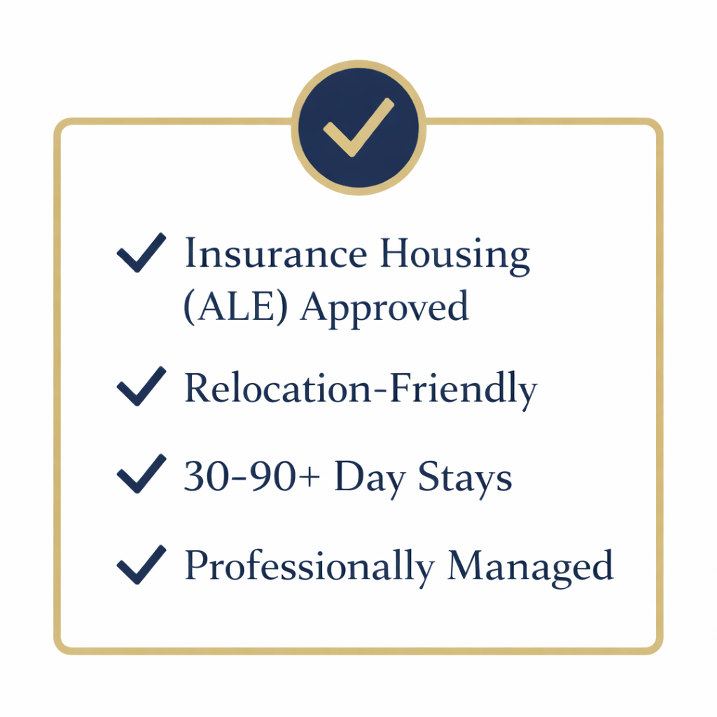 Each residence is thoughtfully prepared with fully equipped kitchens, dedicated workspaces, garage parking, and high-speed WiFi — ideal for stays of 30 to 90+ days.